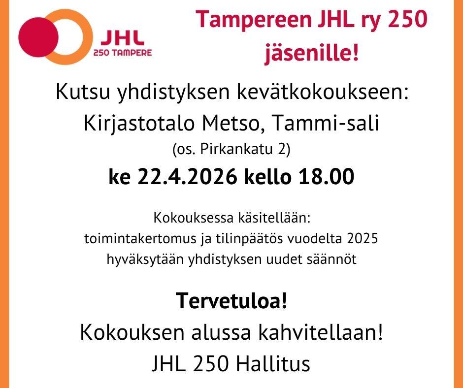 JHL 250 on Pirkanmaan suurin yhdistys johon kuuluu yli 2500 jäsentä. Jäsenemme työskentelevät pääsääntöisesti Tampereen kaupungilla varhaiskasvatuksessa ja perusopetuksessa sekä toimistotyössä ja Pirkanmaan Voimian työntekijöinä ympäri Pirkanmaata.