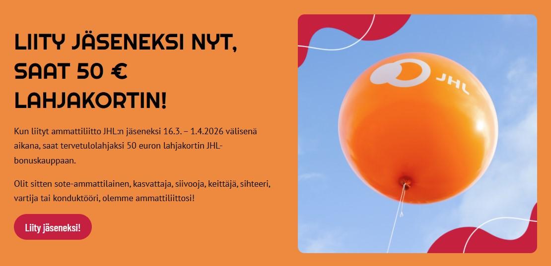 Liittymällä ammattiliitto JHL:n jäseneksi 16.3.–1.4.2026 välisenä aikana, saat tervetulolahjaksi 50 euron lahjakortin JHL-bonuskauppaan.